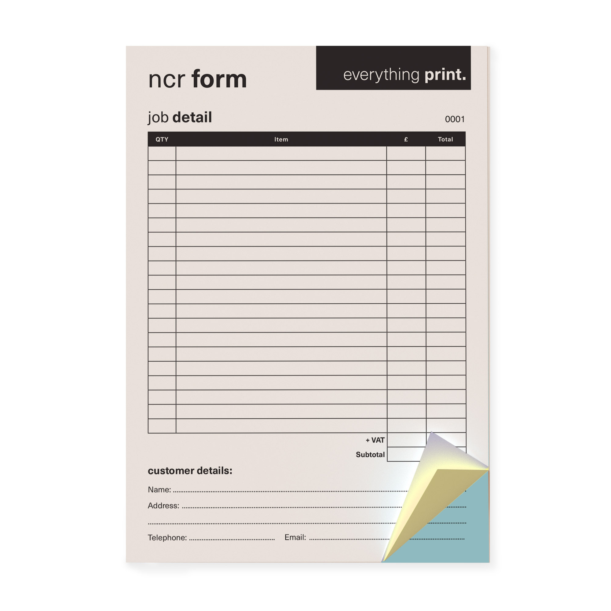 NCR (No Carbon Required) paper allows you to produce easy carbonless duplicate or triplicate copies of documents simply by writing on the top sheet. This makes it perfect for 2-part, 3-part or 4-part carbonless order forms, receipt pads, invoices, packing slips, carbon copy legal forms, purchase order forms, waste transfer notes, duty of care sheets, defect reports, expense tickets, etc. Our NCR set printing service is fast, easy to use, with some of the most competitive prices on the internet.